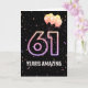 Balões de festa e confete em fundo preto com o neon número 61 para um aniversário de 61ruas.