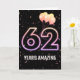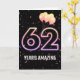 Balões de festa e confete sobre fundo negro com o neon número 62 para um aniversário de 62 anos.