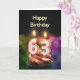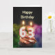 Um bolo de aniversário com velas. As velas são compostas pelo número 63, por 63 anos. Um cartão de aniversário adequado para todos.