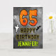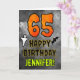 A frente deste design de cartões de aniversário temático e assustador do Dia das Bruxas apresenta um grande número "65". Também apresenta a mensagem "FELIZ ANIVERSÁRIO", além de um nome editável. Há também representações de um fantasma e um morcego na frente. O dentro apresenta uma mensagem de saudação de aniversário editável, ou talvez pudesse ser apagado e deixado o vazio se uma mensagem fosse escrita manualmente. Um cartão de aniversário personalizável como este pode ser uma maneira divertida de reconhecer o sexagésimo quinto aniversário de alguém que também cai no Halloween (31 de outubro). [~Z0000547]