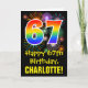 A frente deste divertido, colorido e emocionante design de cartão de aniversário apresenta um grande número "67" com um padrão inspirado no gradiente do espectro do arco-íris, juntamente com a mensagem "Feliz Aniversário de 67 anos", e um nome de destinatário editável. A frente também tem um padrão de fundo colorido inspirado na aparência de fogos de artifício comemorativos estourando. O interior apresenta uma mensagem de aniversário personalizada, ou talvez possa ser limpo e deixado em branco se uma mensagem for escrita à mão. Um cartão de aniversário personalizável como este pode ser uma maneira divertida de reconhecer o aniversário de alguém de 67 anos. [~Z0000442]