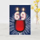 Um copo de vinho de aniversário com velas. As velas são compostas pelo número 69, para um aniversário de 69 anos. Os fogos de artifício estão a explodir ao fundo. Um cartão de aniversário adequado para qualquer pessoa, homem ou mulher.