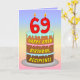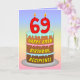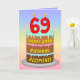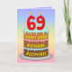 Este design de cartão de saudação de aniversário divertido e colorido apresenta uma representação em estilo cartoon de um bolo de aniversário de três níveis com velas em forma numérica no topo mostrando o número "69", juntamente com a mensagem "HAPPY 69TH BIRTHDAY", e um nome de destinatário personalizado. O fundo da frente tem um espectro multicolorido de arco-íris pastel inspirado em gradiente. O dentro tem uma mensagem de saudação de aniversário personalizada, ou talvez pudesse ser apagado e deixado vazio se uma mensagem fosse escrita manualmente. Um cartão de cumprimentos de aniversário alegre e personalizável como este pode ser uma maneira divertida de entregar cartões de aniversários a alguém que comemora seu sexagésimo nono aniversário. [~Z0000625]