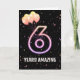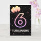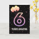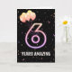 Balões de festa e confete sobre fundo preto com o neon número 6 para um 6.