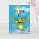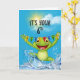 Sapo verde com faixa de aniversário saltando da água azul no fundo do céu para o 6 de aniversário de uma criança.