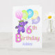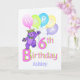 Uma princesa de ursos roxos vestida com uma adorável coroa amarela e flores rosa, azuis e verdes está dançando no aniversário B e segurando um monte de balões coloridos com a palavra FELIZ neles. Este feliz cartão de aniversário trará um sorriso a uma garota especial no seu aniversário de 6. Personalize com o nome dela na frente da placa e no verso dentro para torná-la mais especial. Design original do Anura Design Studio.