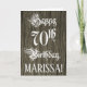 A frente deste design de cartão de felicitações temático de aniversário luxuoso e elegante apresenta a mensagem “Feliz aniversário de 70 anos,” em texto com estilo de letra ornamentada. A frente também apresenta um nome de destinatário personalizado e um padrão de fundo com aparência de madeira falsa. O interior tem uma mensagem de saudação de aniversário editável ou talvez possa ser limpo e deixado em branco se uma mensagem for escrita à mão. Um cartão de aniversário editável e opulento como este pode ser usado para reconhecer o aniversário de setenta anos de alguém.
