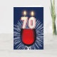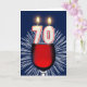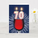 Um copo de vinho de aniversário com velas. As velas são feitas do número 70, para um 70. Os fogos de artifício estão a explodir ao fundo. Um cartão de aniversário adequado para qualquer pessoa, homem ou mulher.