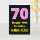 Este design de cartão de saudação de aniversário alegre e divertido apresenta um grande número "70" com um padrão listrado contendo formas cardíacas coloridas cor-de-rosa escuro e rosas claro na frente. A frente também apresenta a mensagem de saudação de aniversário "Feliz Aniversário de 70", e um nome de destinatário personalizável. O dentro apresenta uma mensagem de saudação de aniversário editável, ou talvez pudesse ser apagado e deixado o vazio se uma mensagem fosse escrita manualmente. Um cartão de aniversário personalizado como este pode ser uma maneira divertida de enviar desejos de aniversário a alguém que comemora seu setuagésimo aniversário. Também pode ser uma escolha divertida para alguém que tenha um aniversário que cai no Dia de os namorados (14 de fevereiro), devido aos seus carinchos símbolos e cores. [~Z0000434]