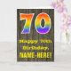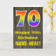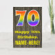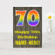 A frente deste design de saudação de aniversário colorido, mas rústico, apresenta um grande número de "70" com um padrão inspirado pelo gradiente do espectro arco-íris. Ele também apresenta a mensagem "Feliz 70 Aniversário", e um nome de destinatário personalizado. A frente apresenta um fundo que representa um padrão de aparência rústico do grão de madeira falsa. O dentro apresenta uma mensagem de saudação de aniversário personalizada, ou talvez possa ser apagado e deixado o vazio se uma mensagem for escrita manualmente. Um cartão de aniversário personalizável como este pode ser uma maneira divertida de celebrar o setuagésimo aniversário de alguém. [~Z0000419]