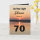 Celebre a alegria de um aniversário de 70 com o cartão de citação de bíblia "Let Your Light Shine" (Mateus 5:16). O texto das escrituras tem uma design ousada de 70, mostrando um nascer de sol negro e dourado em um lago pacífico. A bênção envia uma mensagem de fé e amor. Abra a carta para ler o carinhoso verso de aniversário para uma inspiradora celebração do 70º aniversário.