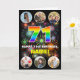 A frente desta alegre e otimista design de saudação de aniversário apresenta um grande número "71" com um padrão de gradação inspirado no espectro arco-íris multicolorido, juntamente com a mensagem "FELIZ 71rua IRTHDAY" e um nome personalizado, em um padrão inspirado em fogos de artifício multicoloridos. No topo e no fundo da frente estão imagens que podem ser personalizadas, talvez com fotos da família e amigos do receptor. O dentro tem uma mensagem de saudação de aniversário personalizável, ou talvez pudesse ser apagado e deixado o vazio se uma mensagem fosse escrita manualmente. Um cartão de cumprimentos de aniversário ousado e personalizado como este pode ser uma maneira divertida de enviar alguns desejos de aniversário a alguém que está celebrando seu setenta e um anos. (Fotografia © Storytree Studios, Stanford, CA.) [~Z0000660]