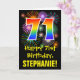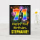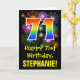The front of this fun, colorful, and exciting birthday themed greeting card design features a large number "71" having a rainbow spectrum gradient inspired pattern. It also features the message "Happy 71st Birthday,", and an editable recipient name. The front additionally has a colorful background pattern inspired by the appearance of bursting celebratory fireworks. The inside features a customized birthday greeting message, or could perhaps be cleared and left blank if a message is to be written by hand instead. A customizable birthday card like this might be a fun way to send a message celebrating somebody’s seventy first birthday. [~Z0000442]