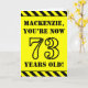 A frente deste design de cartão de saudação temático de aniversário divertido e ousado apresenta um nome editável e a mensagem "VOCÊ ESTÁ AGORA COM 73 ANOS!" em estêncil preto texto de aparência em um fundo amarelo. A parte frontal também apresenta um padrão de listras amarelas e pretas que se chama olho nas bordas superior e inferior. O dentro apresenta uma mensagem de saudação de aniversário personalizada, ou talvez possa ser apagado e deixado vazio se uma mensagem for escrita manualmente. Um cartão de aniversário personalizado como este pode ser uma maneira divertida de enviar uma mensagem em comemoração dos setenta e três anos de alguém. [~Z0000413]