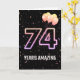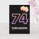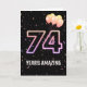 Balões de festas e confete sobre fundo negro com o neon número 74 para um 74º aniversário.