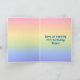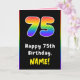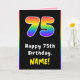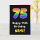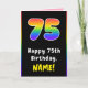 Este design de carta de saudação de aniversário otimista e alegre apresenta o número "75" com um espectro de arco-íris multicolorido vibrante e inspirado em um padrão de gradiente, junto com a mensagem "Feliz 75º aniversário", e um nome de destinatário personalizado. O dentro tem uma mensagem de saudação de aniversário personalizável, ou talvez pudesse ser apagado e deixado o vazio se uma mensagem fosse escrita manualmente. Um cartão de saudação de aniversário divertido e personalizado como este pode ser enviado para celebrar o setenta e cinco anos de alguém. [~Z0000627]