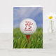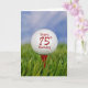 Feche acima de uma bola de golfe branca em um T vermelho na grama com fundo do céu para o 75th aniversário.