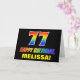 A frente desse design de cartão de saudação de aniversário alegre, colorido e divertido apresenta um grande número "77" e a mensagem "FELIZ ANIVERSÁRIO", ambos tendo um gradiente de padrão inspirado no espectro do arco-íris, juntamente com um nome de destinatário personalizado amarelo ousado. A frente também apresenta um fundo preto minimalista. O dentro apresenta uma mensagem de saudação de aniversário personalizável, ou talvez possa ser apagado e deixado o vazio se uma mensagem for escrita manualmente. Um cartão de aniversário colorido personalizado como este pode ser uma maneira divertida de enviar uma mensagem em comemoração do setenta e sete anos de alguém. [~Z0000472]