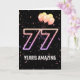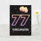 Balões de festa e confete sobre fundo negro com o neon número 77 para 77 anos.