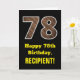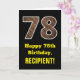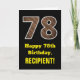 Este design de cartões de saudação, com tema de aniversário, rústico e divertido apresenta um grande número de "78" tendo um padrão de aparência inspirado em madeira imitada na frente. A frente também apresenta a mensagem de saudação de aniversário "Feliz 78º aniversário", e um nome de destinatário editável. O dentro apresenta uma mensagem de saudação de aniversário personalizada, ou talvez possa ser apagado e deixado vazio se uma mensagem for escrita manualmente. Um cartão de aniversário personalizável como este pode ser uma maneira divertida de enviar uma mensagem em comemoração dos setenta e oito anos de alguém. [~Z0000433]