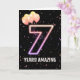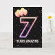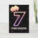 Balões de festa e confete sobre fundo preto com o neon número 7 para um 7.