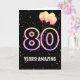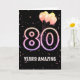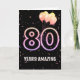 Balões de festa e confete sobre fundo preto com o neon número 80 para um 80.