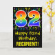 A frente deste design de cartão de saudação divertida, vibrante e colorida com tema de aniversário apresenta um grande número de "82" tendo um padrão inspirado no gradiente do espectro arco-íris. Também apresenta a mensagem "Feliz 82º Aniversário", e um nome de destinatário personalizado. A frente também tem um padrão de várias notas e símbolos de música com várias cores e tamanhos. O dentro apresenta uma mensagem de saudação de aniversário personalizada, ou talvez possa ser apagado e deixado vazio se uma mensagem for escrita manualmente. Um cartão de aniversário personalizável como este pode ser uma maneira divertida de celebrar o oitenta e segundo aniversário de alguém. [~Z0000420]