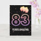 Balões de festa e confete sobre fundo negro com o neon número 83 para um aniversário de 83 anos.