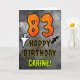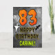 A frente deste design de cartões de saudação de aniversário temático e assustador do Hallowe'en apresenta um grande número "83". Também apresenta a mensagem "FELIZ ANIVERSÁRIO" e um nome editável. Há também representações de um fantasma e um morcego na frente. O dentro apresenta uma mensagem de saudação de aniversário personalizada, ou talvez possa ser apagado e deixado o vazio se uma mensagem for escrita manualmente. Um cartão de aniversário personalizável como este pode ser uma maneira divertida de reconhecer o oitenta e terceiro aniversário de alguém que também cai no dia 31 de outubro (Halloween). [~Z0000547]