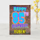 A frente desta divertida design de cartões de saudação com tema de aniversário apresenta a mensagem "FELIZ 85º ANIVERSÁRIO", tendo uma aparência colorida, vibrante e inspirada no grafite urbano, além de um nome de destinatário personalizado. O fundo da frente apresenta um padrão inspirado pela aparência de uma parede de tijolos. O dentro tem uma mensagem de saudação de aniversário personalizada, ou talvez pudesse ser apagado e deixado vazio se uma mensagem fosse escrita manualmente. Um cartão de saudação de aniversário divertido e personalizável como este pode ser usado para celebrar o oitenta e cinco anos de alguém. [~Z0000531]