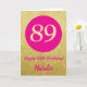 Cartão 89º aniversário feliz, rosa quente e Dourado brilh