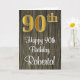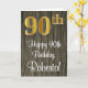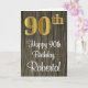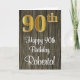 Este luxuoso, sofisticado e elegante design de cartão de saudação com tema de aniversário apresenta um grande número ordinal "90" com um olhar falsa/imitado inspirado em ouro, juntamente com a mensagem de saudação de aniversário "Feliz 90 de Aniversário", e um nome personalizável numa letra estilo script na frente. Também tem um padrão de fundo falsa inspirado em madeira na frente. O dentro tem uma mensagem de saudação de aniversário personalizada, ou talvez pudesse ser apagado e deixado vazio se uma mensagem for escrita manualmente. Um cartão de cumprimentos de aniversário personalizado como este pode ser usado para celebrar o nonagésimo aniversário de alguém. [~Z0000519]