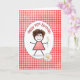 Garota bonitinha com cabelo, óculos vermelhos, vestido de gingham, e segurando margaridas em um padrão de gingham vermelho e branco para o aniversário de 90. O número de idade pode ser alterado.