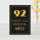 A frente deste estilo de 1920 de 1930 inspirou o design de cartão de saudação temático de aniversário com um grande estilo de deco inspirado no número "92", a mensagem "FELIZ 92. º ANIVERSÁRIO", um nome editável e um padrão de borda consistindo em linhas. Há um fundo de cor preta na frente. O dentro apresenta uma mensagem de saudação de aniversário personalizada, ou talvez possa ser apagado e deixado vazio se uma mensagem for escrita manualmente. Um cartão de aniversário personalizável como este pode ser uma maneira divertida de enviar uma mensagem em comemoração do nonagésimo segundo aniversário de alguém. [~Z0000502]
