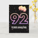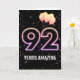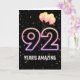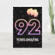 Balões de festa e confete sobre fundo negro com o neon número 92 para um 92º aniversário.