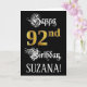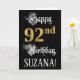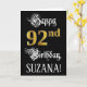 A frente deste design de cartão de saudação, com tema de aniversário, afável e opulente, mostra a mensagem "Feliz 92º Aniversário", junto com um nome de destinatário personalizado. Parte da mensagem está em um texto estilo script de rico, o grande número "92º" apresenta um padrão de aparência falsa/imitado inspirado em ouro, e o fundo é preto colorido. O dentro tem uma mensagem de saudação de aniversário editável, ou talvez possa ser apagado e deixado vazio se uma mensagem for escrita manualmente. Um cartão de cumprimentos de aniversário luxuoso e personalizado como este pode ser uma maneira respeitável de entregar alguns desejos de aniversário a alguém que está celebrando seu aniversário de noventa e dois anos. [~Z0000559]
