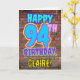 A frente deste design de cartão de saudação com tema de aniversário divertido apresenta a mensagem "FELIZ 94º ANIVERSÁRIO", tendo um olhar colorido, vibrante e inspirado no grafite, além de um nome de destinatário editável. O fundo da frente apresenta um padrão inspirado na parede do tijolo. O dentro tem uma mensagem de saudação de aniversário personalizada, ou talvez pudesse ser apagado e deixado vazio se uma mensagem for escrita manualmente. Um cartão de saudação de aniversário divertido e personalizável como este pode ser usado para celebrar o 94.º aniversário de alguém. [~Z0000531]