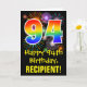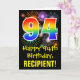 A frente deste design de cartão de saudação colorida, divertida e excitante aniversariante apresenta um grande número "94" com um padrão inspirado no gradiente do espectro arco-íris, juntamente com a mensagem "Feliz 94.º Aniversário", e um nome de destinatário personalizado. A frente também tem um padrão de fundo colorido inspirado pela aparência de fogos de artifício comemorativos em explosão. O dentro apresenta uma mensagem de saudação de aniversário personalizada, ou talvez possa ser apagado e deixado o vazio se uma mensagem for escrita manualmente. Um cartão de aniversário personalizado como este pode ser uma maneira divertida de enviar uma mensagem em comemoração do 90° aniversário de alguém. [~Z0000442]