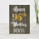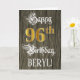 A frente deste ornamentado e design de cartão de saudação temático de aniversário elegante apresenta a mensagem "Feliz 96º aniversário", e um nome de destinatário personalizado. Parte da mensagem está no texto luxuoso do estilo script. O grande número "96º" apresenta um padrão de aparência inspirado em ouro de imitação/falsa. O fundo tem um padrão falsa/imitado de grãos de madeira. O dentro tem uma mensagem de saudação de aniversário editável, ou talvez possa ser apagado e deixado vazio se uma mensagem for escrita manualmente. Um cartão de cumprimentos de aniversário formal e personalizado como este poderia ser usado para reconhecer o aniversário de 96 anos de alguém. [~Z0000561]