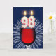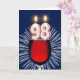Um copo de vinho de aniversário com velas. As velas são compostas pelo número 98, para um aniversário de 98 anos. Os fogos de artifício estão a explodir ao fundo. Um cartão de aniversário adequado para qualquer pessoa, homem ou mulher.