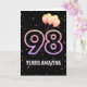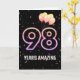Balões de festa e confete sobre fundo negro com o neon número 98 para um aniversário de 98 anos.