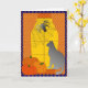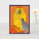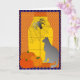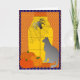 Um cartão de Dia das Bruxas ilustrado mostrando um gato observando uma aranha em sua teia com cuidado.