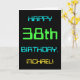 Este simples e divertido design de cartões de aniversário apresenta uma mensagem como "FELIZ 38 ANOS, MICHAEL!". Seu olhar é inspirado pelo campo da computação digital. O nome na frente e a mensagem no dentro podem ser personalizados. Ele poderia ser enviado ou dado a alguém que comemora seus trinta e oito anos de aniversário, e que talvez trabalhe (ou trabalhou antes da aposentadoria) como administrador de banco de dados, programador de computador, administrador de rede, desenvolvedor de software, engenheiro elétrico ou que de outra forma gosta de usar computadores. [~Z0000100]
