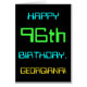 Este simples e divertido design de cartões de aniversário apresenta uma mensagem como "FELIZ 96º ANIVERSÁRIO, GEORGIANA!". Sua aparência é inspirada no campo da computação digital. O nome na frente e a mensagem no dentro podem ser personalizados. Ele poderia ser enviado ou dado a alguém que comemora seu 96º aniversário, e que talvez trabalhe (ou trabalhou antes da aposentadoria) como administrador de banco de dados, programador de computador, administrador de rede, desenvolvedor de software, engenheiro elétrico ou que, de outra forma, gosta de usar computadores. [~Z0000100]