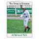 A grama é mais verde no prado de Belmont. Um sorriso e um jóquei feliz "John Velasquez" que veste as sedas brancas com pontos pretos, entram no pasto verde desta pista histórica em Elmont, NY enquanto aponta para esta grama verde gostoso. O fundo apresenta o signage verde icónico que cerca os trilhos brancos do prado.