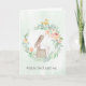 An adorable little bunny rabbit sniffs one of the pink roses in a pretty floral wreath on the front of this birthday card. A little yellow bird sits on top of the wreath, looking rather smug. The text at the bottom says "A little bird told me..." The sentiment is continued on the inside of the card, which states "It's your BIRTHDAY!" There is a second text field on the inside that you may customize. The card is finished with a pretty matching floral bouquet design at one side. All the images are in delicate watercolor, with a pale blue green watercolor wash on the front. Appropriate for birthdays at any age.