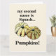 Abóbora Squash Cartão de Abóboras Engraçadas design original de Nisha Prabhu. Traga um sorriso ao rosto dos seus entes queridos com nosso encantador cartão "Abóbora Squash"! Perfeito para qualquer ocasião de outono, este cartão é ideal para enviar votos calorosos, convites ou apenas um bilhete caprichoso para alegrar o dia de alguém. Com ilustrações divertidas de abóboras e squash animados, juntamente com uma mensagem humorística, este cartão captura o espírito divertido do outono e torna-se um cumprimento memorável. Seja para o Halloween, Dia de Ação de Graças ou apenas para dizer "olá", este cartão é perfeito para compartilhar seus cumprimentos sazonais ou para qualquer ocasião especial no outono! Celebre a temporada de colheita e alegria com nosso cartão Abóbora Squash. É uma maneira encantadora de se conectar com
