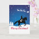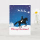 Uma bela cena de inverno com Papai Noel voando com seus renas no céu enquanto um lindo cavalo de adestramento se apresenta acima da saudação "Feliz Natal". Se você gostar deste design, por favor, confira minha loja Patty's Pet Art para mais designs equestres.
