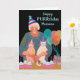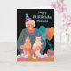 Adicione um nome, Happy PURRthday Marianne, cartão de boas-vindas em papel com uma ilustração colorida da festa de aniversário com uma senhora mais velha e dois gatos em modo de festa. Os gatos estão vestindo chapéus de festa, assim como a senhora. Uma fila de cupcakes com velas de aniversário está na mesa. Balões e um presente também estão na design. Arte, imagem e direitos de autor versos © Shoaff Ballanger Studios, 2023.