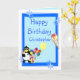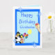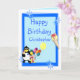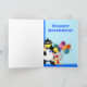Cartão totalmente personalizável com palhaço engraçado, pinguim, sorvete e balões, em fundo azul. Personalize facilmente este design, adicionando ou alterando o texto.